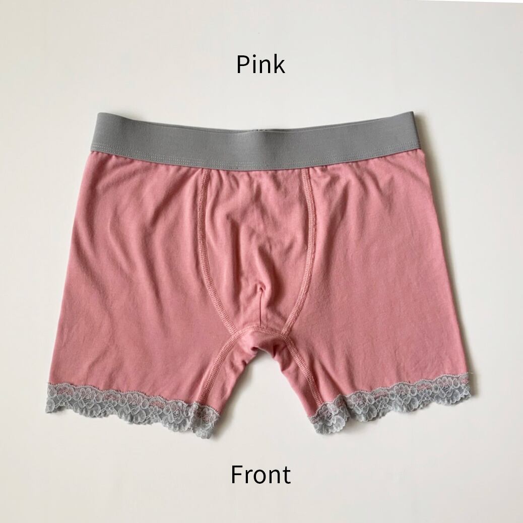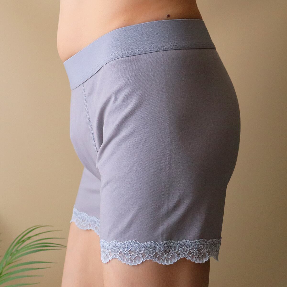 オーソドックスなボクサーパンツの足口にレースをつけて、ささやかにフェミニンにしたボクサーパンツです。フェミニンなアンダーウェアが気になる男性に、第一歩として着用しやすいデザインに仕上がっています。